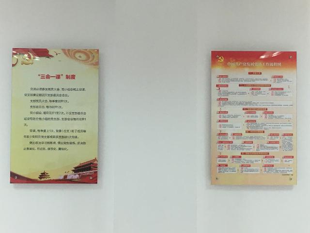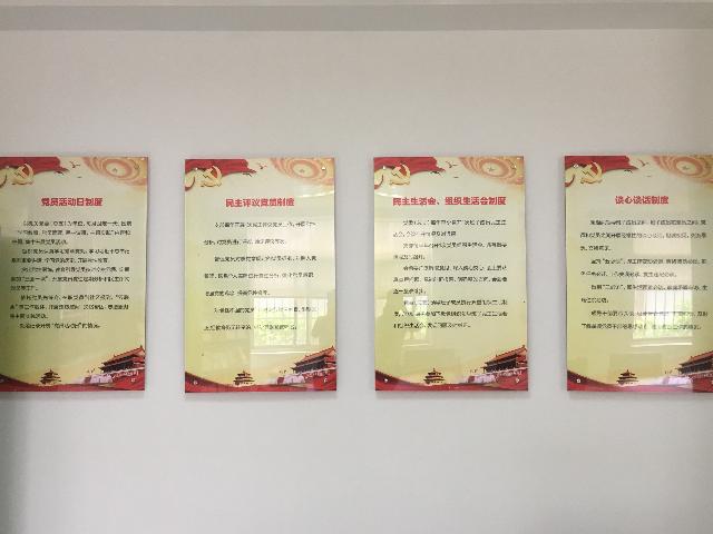 黨員活動室在醒目位置特設(shè)主題教育墻,包括黨旗、入黨誓詞、黨員義務(wù)和權(quán)利;顒邮覂(nèi)有8個宣傳展版,內(nèi)容包括組織架構(gòu)圖、黨委委員崗位職責(zé)、紀(jì)委委員崗位職責(zé)、民主生活會組織生活會制度、“三會一課”制度、民主評議黨員制度、發(fā)展黨員工作流程圖和黨員活動日制度。活動室還配備了報刊書架,擺放黨員學(xué)習(xí)書刊雜志等。